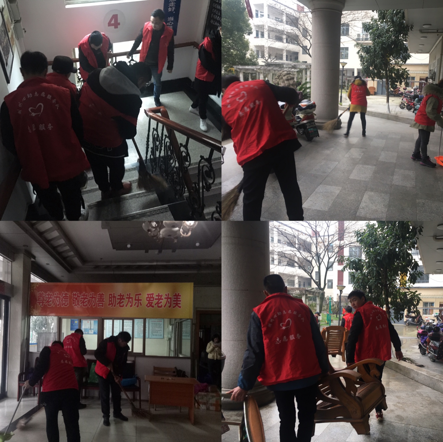 2019年3月5日,湖州红十字心理健康志愿服务队两名志愿者组织龙泉、妙西街道社区矫正人员进行红丰老年服务中心8小时劳动。早上在中心院大门集合后,大家分工协作,主要内容是将二楼20个房间门进行擦洗,顶楼仓库搬台子并对大厅、门厅和主辅楼梯进行大扫除。