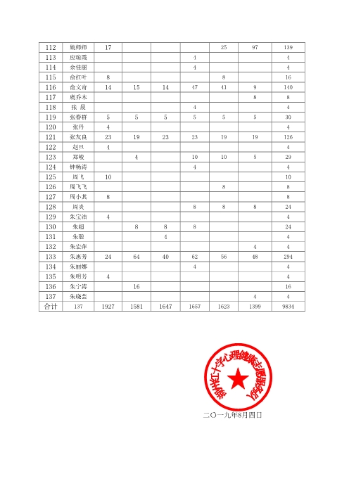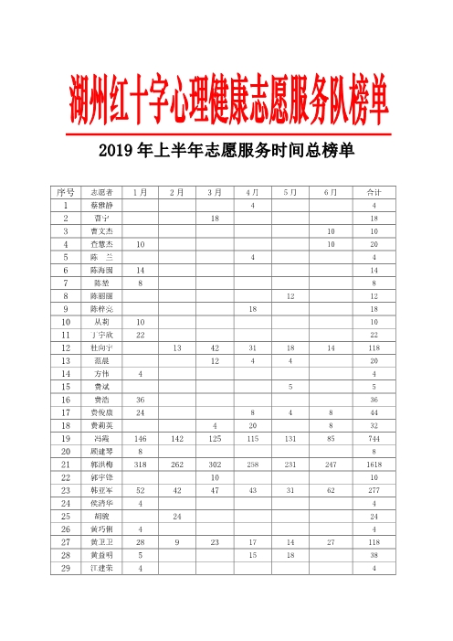 湖州红十字心理健康志愿服务队2019.1-6榜单总表