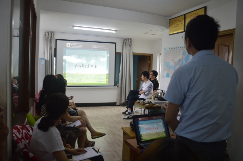 月例会审核并发布了心理热线月度报表,对热线质量进行了团队督导。从月例会上获悉,湖州红十字会心理健康热线(400-051-0572)和湖州红十字心理健康在线http://www.zjhzrcp.org.cn)2014年6月被访来电38例(其中本地来电16例,外地来电22例,正常受理17例,高度危险来电1例),较上月环比下降47.95%;网站总访问量395人次,较上月环比下降8.14%,举办团体心理辅演练、沙盘游戏治疗培训、房树人测试培训、心理危机干预培训、心理督导讨论等内训共8次。另外,倪新芬等四名咨询师志愿者