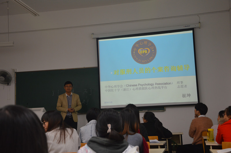 2014-11-16湖州红十字心理志愿服务队队员CPA理事崔坤老师应湖州师院的邀请为师院获得国家咨询师资格证的小学教育专业的大学生进行了一次主题为“对服刑人员的个案咨询辅导”的培训。所有参与培训的学生都非常认真的学习并参与互动,实实在在的掌握了监狱做服刑人员个案咨询的技巧技术,为之后去监狱做个案咨询奠定了扎实的基础。
