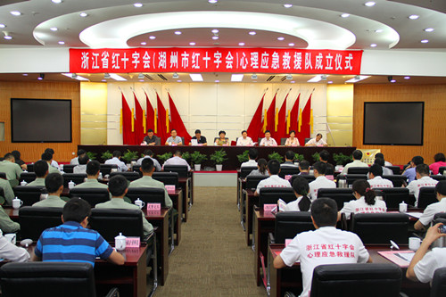 9月24日,省红十字会心理应急救援队暨湖州市红十字会心理应急救援队挂牌授旗仪式在湖州举行,这标志着全省首支红十字会心理应急救援队正式成立。省红十字会党组书记、常务副会长王冬梅,省红十字会党组成员、专职副会长高翔,湖州市副市长、市红十字会会长沈建平,湖州市红十字会专职副会长吴康丽等领导出席仪式,市人大、市政协、市财政局、市教育局、市卫生局、武警湖州支队、市消防支队、市三院等职能处室相关负责人,省、市红十字会心理应急救援队成员以及市红十字会现场救护培训讲师团等90多人参加。市政府副秘书长、市红十字会副会长徐晏平主持仪式。