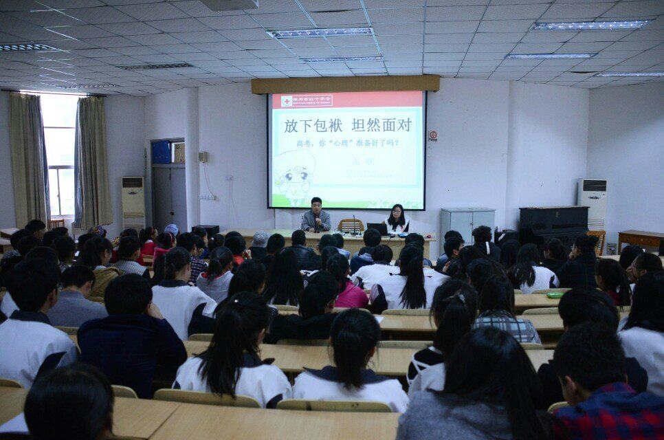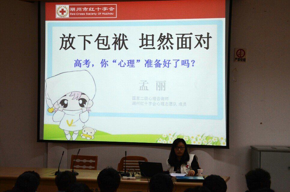 为帮助即将参加高考学生消除临考前的紧张心理,以良好的心态迎接高考,2015年4月20日下午,湖州市红十字会组织心理健康服务志愿者在埭溪中学大礼堂内作了一场《放下包袱 坦然面对—高考,你“心理”准备好了吗?》心理减压讲座。