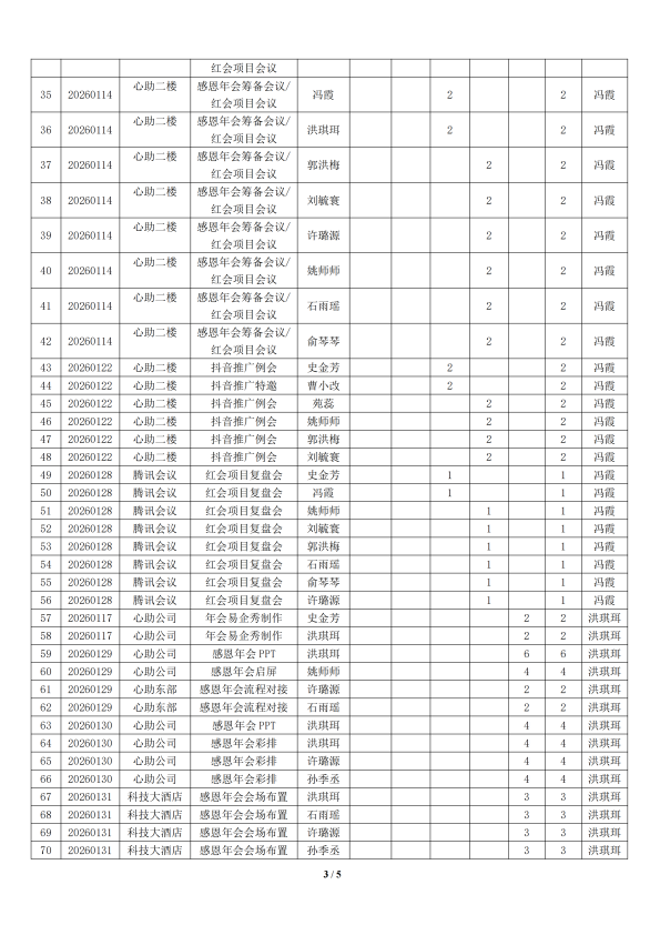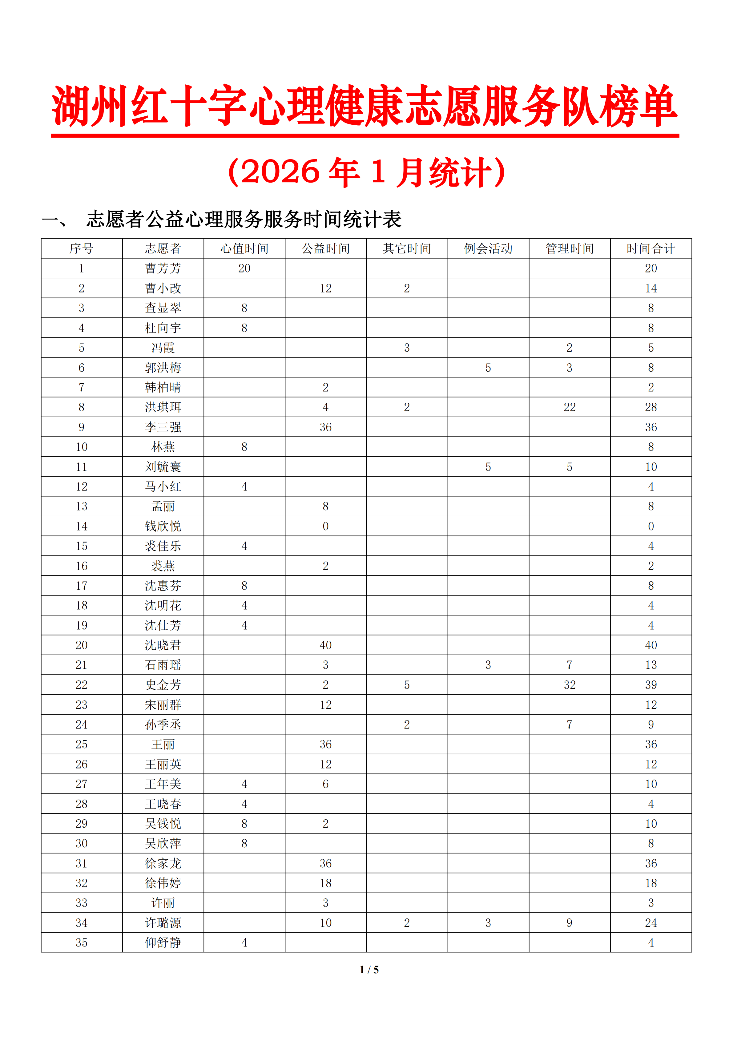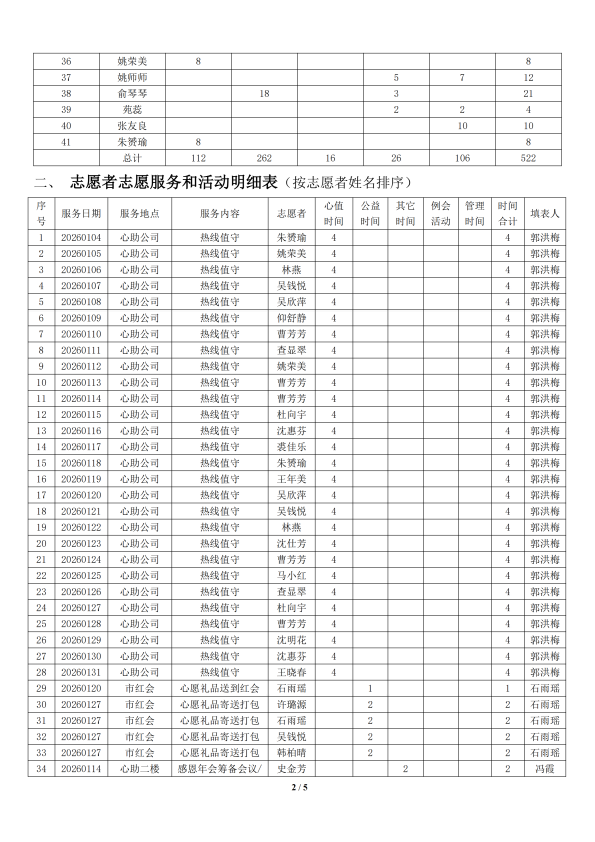 湖州红十字心理健康志愿服务队榜单2026 年 1 月统计